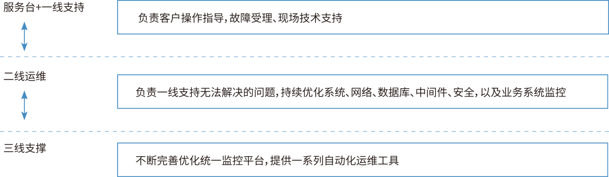 三级运维体系,一线支持,二线运维,三线支撑,多级分工协作,保障日常运维工作,以及自动化运维工具的持续提升。